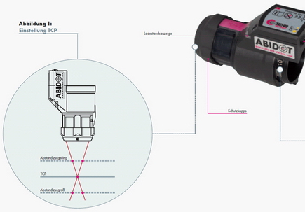 Для программирования сегодня преимущественно применяют свободный конец проволоки, часто это приводит к неточностям позиционирования и определения ошибочного TCP, ненужному расходу проволоки. Четыре лазерных диода устройства ABIDOT направлены от головки и расположены под определенным углом один к одному. Все четыре луча встречаются в одной заданной рабочей точке перед токоподводным наконечником – TCP. Оптимальная позиция головки – отображение на рабочей поверхности только одной точки, сводящей все четыре лазерных луча.