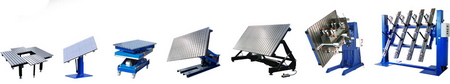 Столы могут быть выполнены либо стационарными, либо подвижными, с функциями поворота, наклона, подъема и вращения. Также к столам предлагаются упорные и зажимные элементы и принадлежности, сварочные шаблоны для ограждений и рам, манипуляторы и устройства специального назначения, мощные устройства.